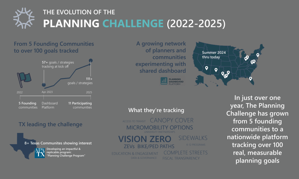 The Planning Challenge is a bold new initiative that aims to transform how we implement and measure success in the planning profession. The Challenge invites communities and planning practitioners—especially those in the public sector—to track the progress of their adopted plans through a shared dashboard platform. With many communities already engaged, this movement is gaining momentum.